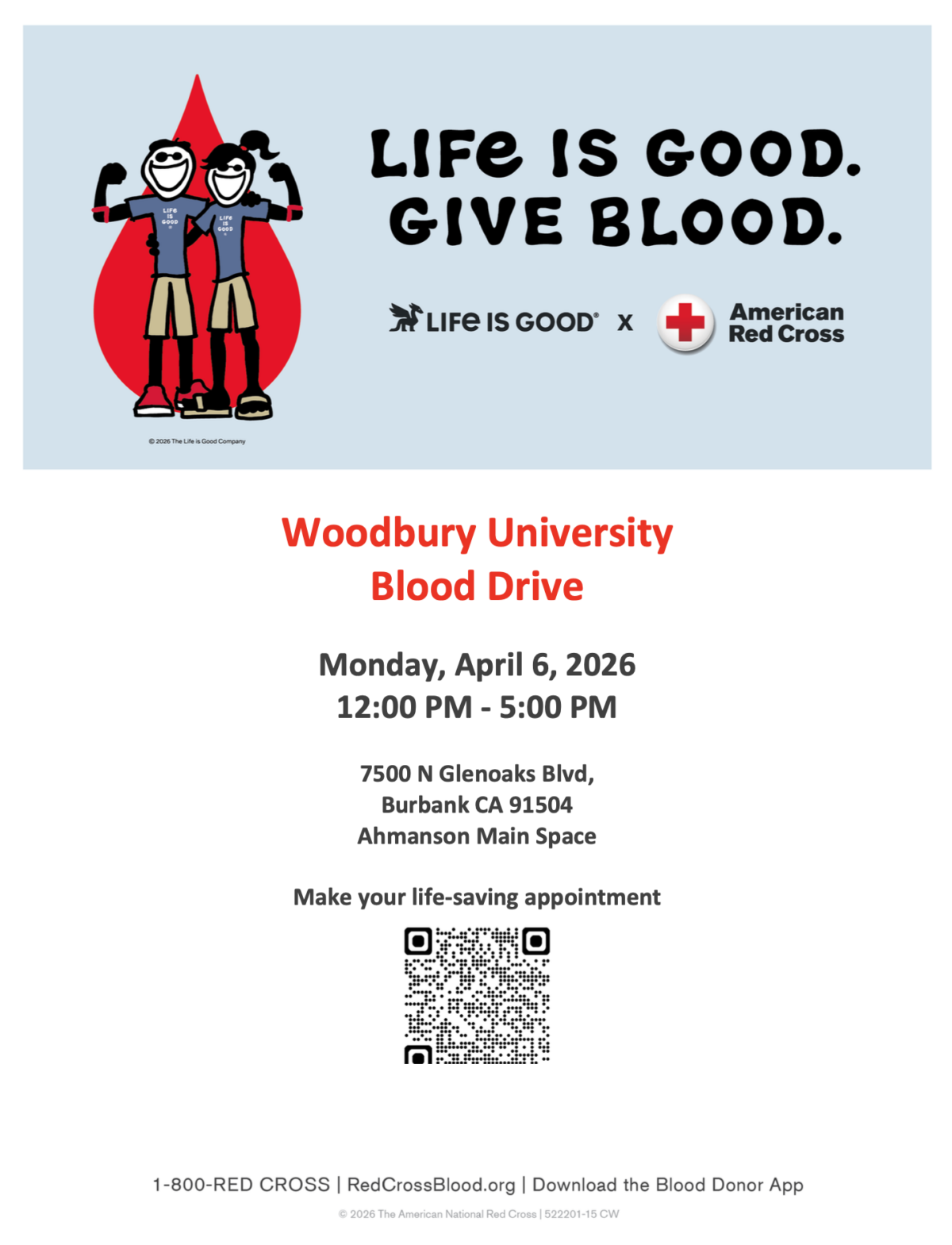 We are once again partnering with the American Red Cross to host a Blood Drive on Monday, April 6, 2026, from 12:00 PM – 5:00 PM in the Ahmanson Main Space.