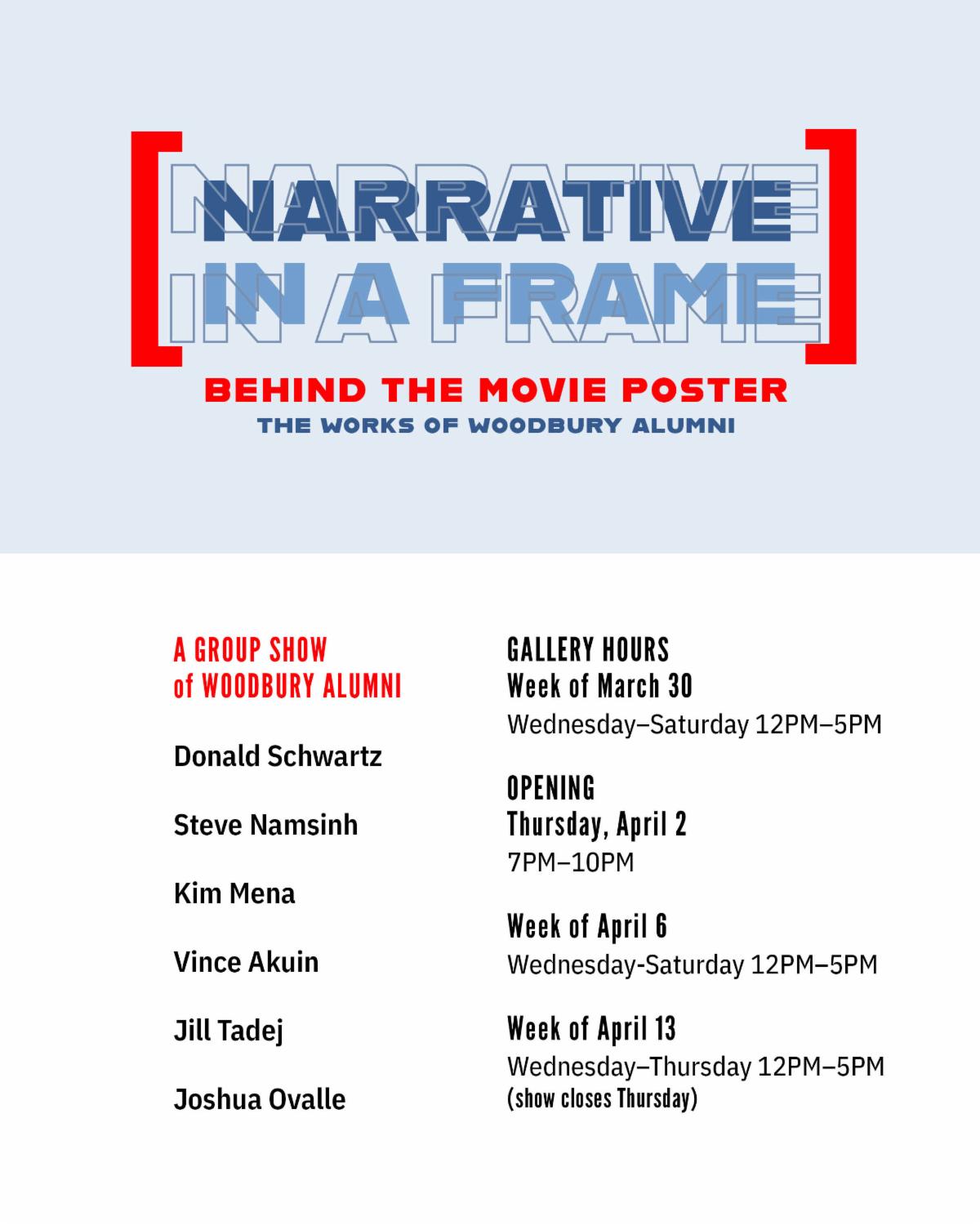 Join us for the opening of Narrative in Frame, an entertainment design exhibition showcasing the work of six Graphic Design alumni from Woodbury University.