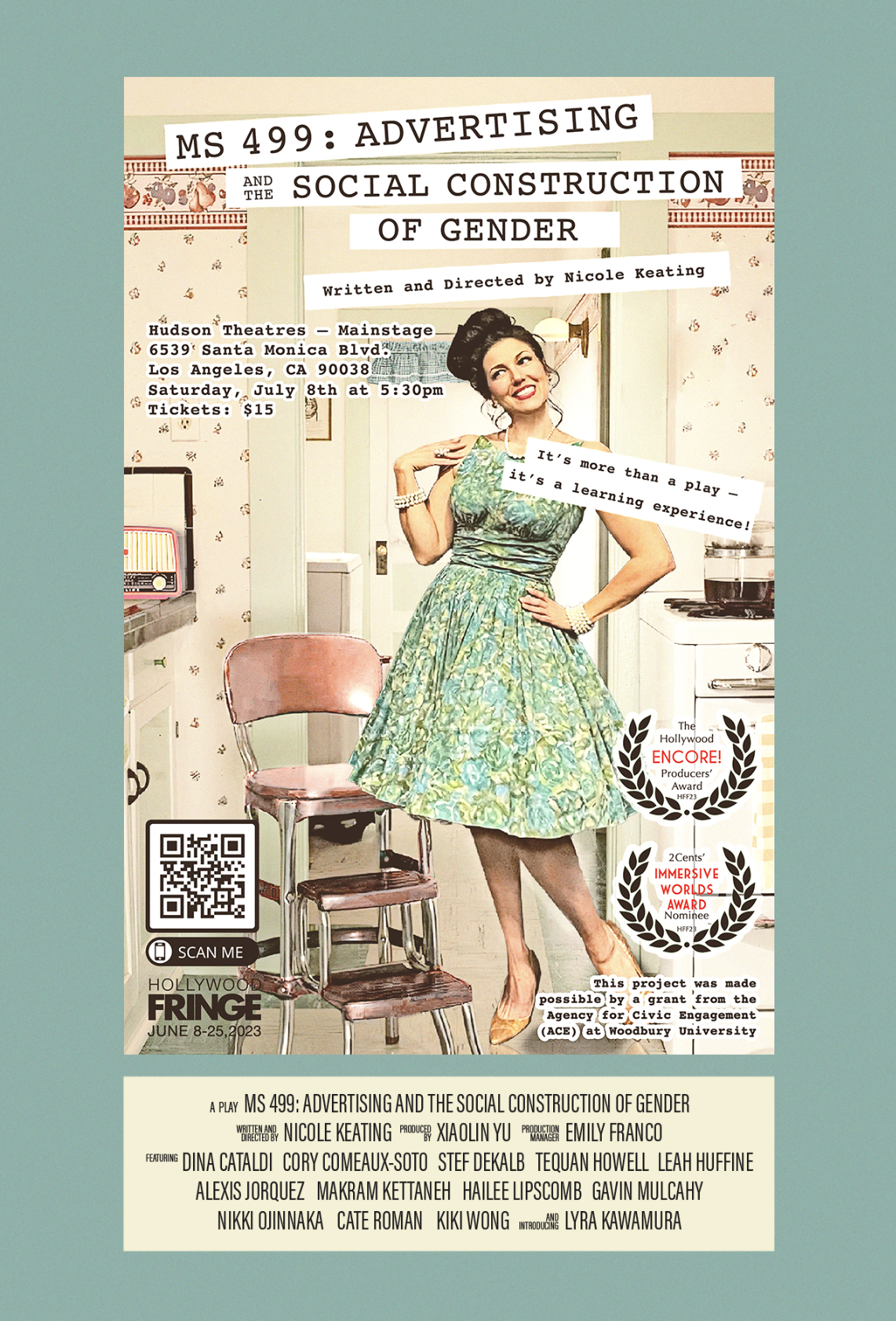 MS 499: Advertising and the Social Construction of Gender is an immersive, comedic play written and directed by Woodbury University Professor Nicole Keating. This theatrical rendition of an atypical “first day of class” made its world premiere at the Hudson Theatres: Mainstage during the Hollywood Fringe Festival 2023. The play was produced by Woodbury University Professor Xiaolin Yu and featured Woodbury University Professor Emeritus Cate Roman as Libby the Liberator/Rosie the Riveter. Numerous Woodbury students and alums participated in the production.