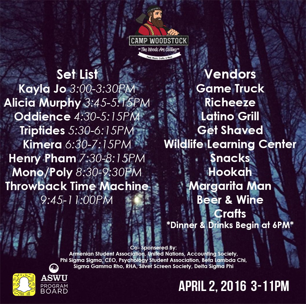 On April 2, ASWU Program board presented its annual concert music festival, Woodstock! It was 8 hours of music, food, fun, and good vibes.