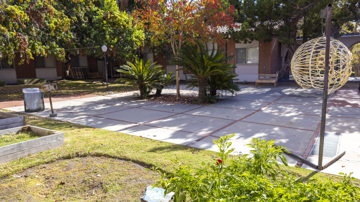 In the South Hall Courtyard the community garden is a space for students, faculty, and staff to come together to care for and tend to a thriving campus green space.
